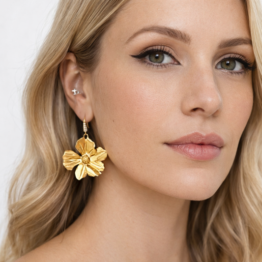 Pendientes Flor Dalia – Maxi Flor con Brillo Central (Plateado y Dorado Waterproof)