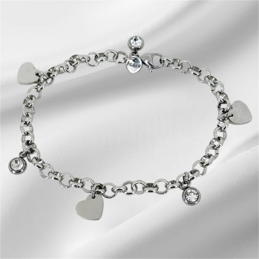 Pulsera de acero con dijes de corazones y circonitas – Personalizable
