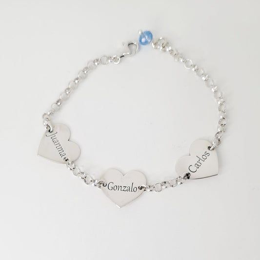 Pulsera de Plata con 3 Corazones Personalizados – Grabada con Nombres