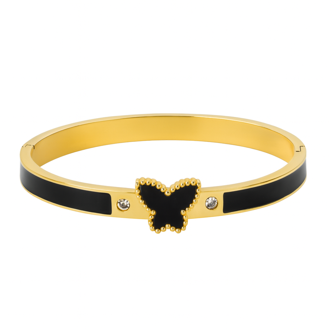 Su diseño incorpora una delicada mariposa esmaltada, símbolo de libertad y transformación, disponible en varios colores para que elijas el que mejor refleje tu personalidad. La pulsera se abre completamente gracias a su sistema articulado, lo que la hace muy fácil de poner y quitar, sin perder su firmeza ni su brillo.