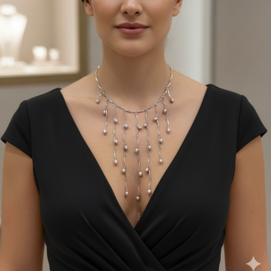 Esta gargantilla es la elección perfecta para mujeres que aprecian la elegancia clásica con un toque contemporáneo. El diseño en cascada de perlas naturales crea un efecto sofisticado que complementa tanto vestidos de noche como looks más casuales elegantes.