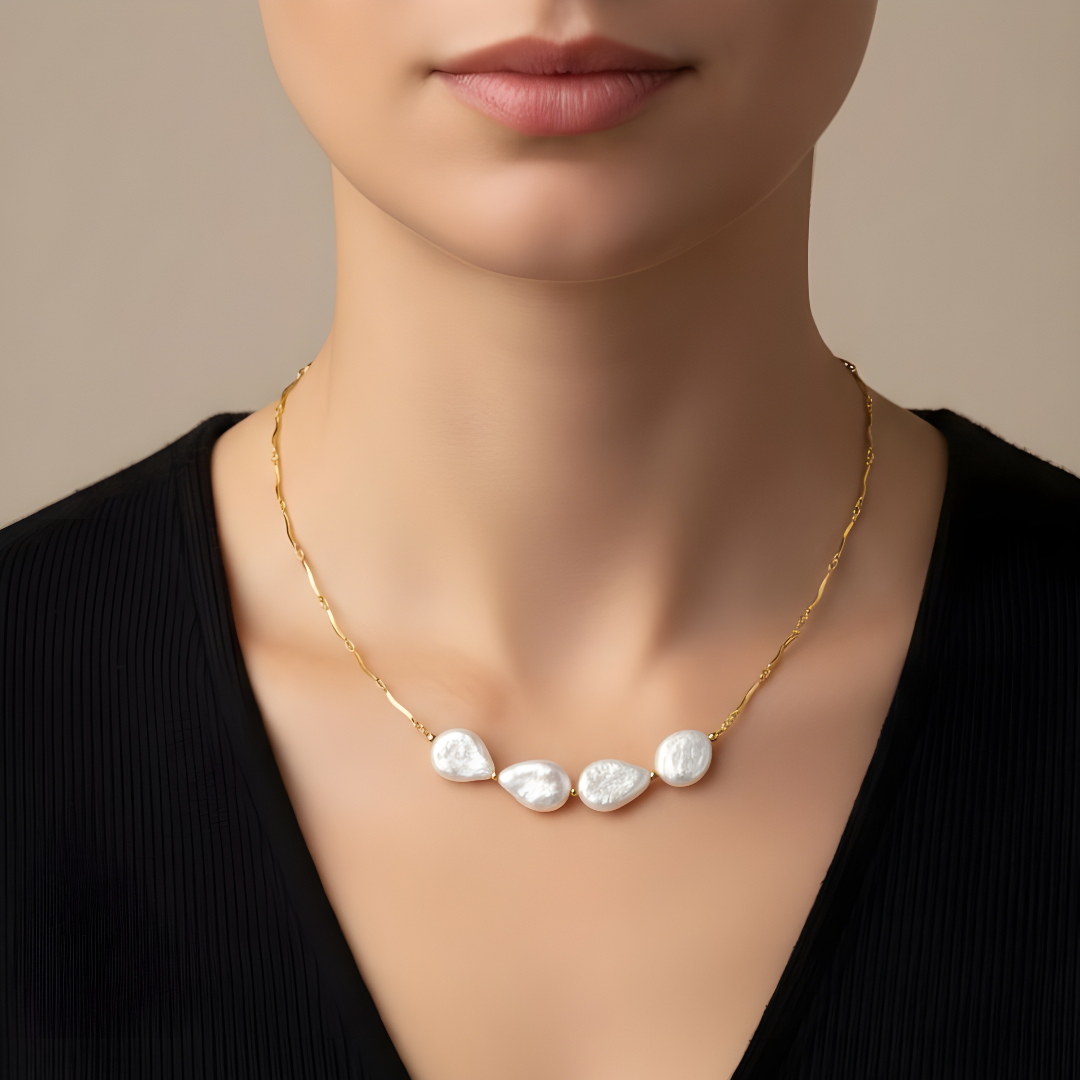 Las perlas barrocas presentan variaciones en forma, brillo y tamaño, lo que convierte cada gargantilla en una joya única e irrepetible.