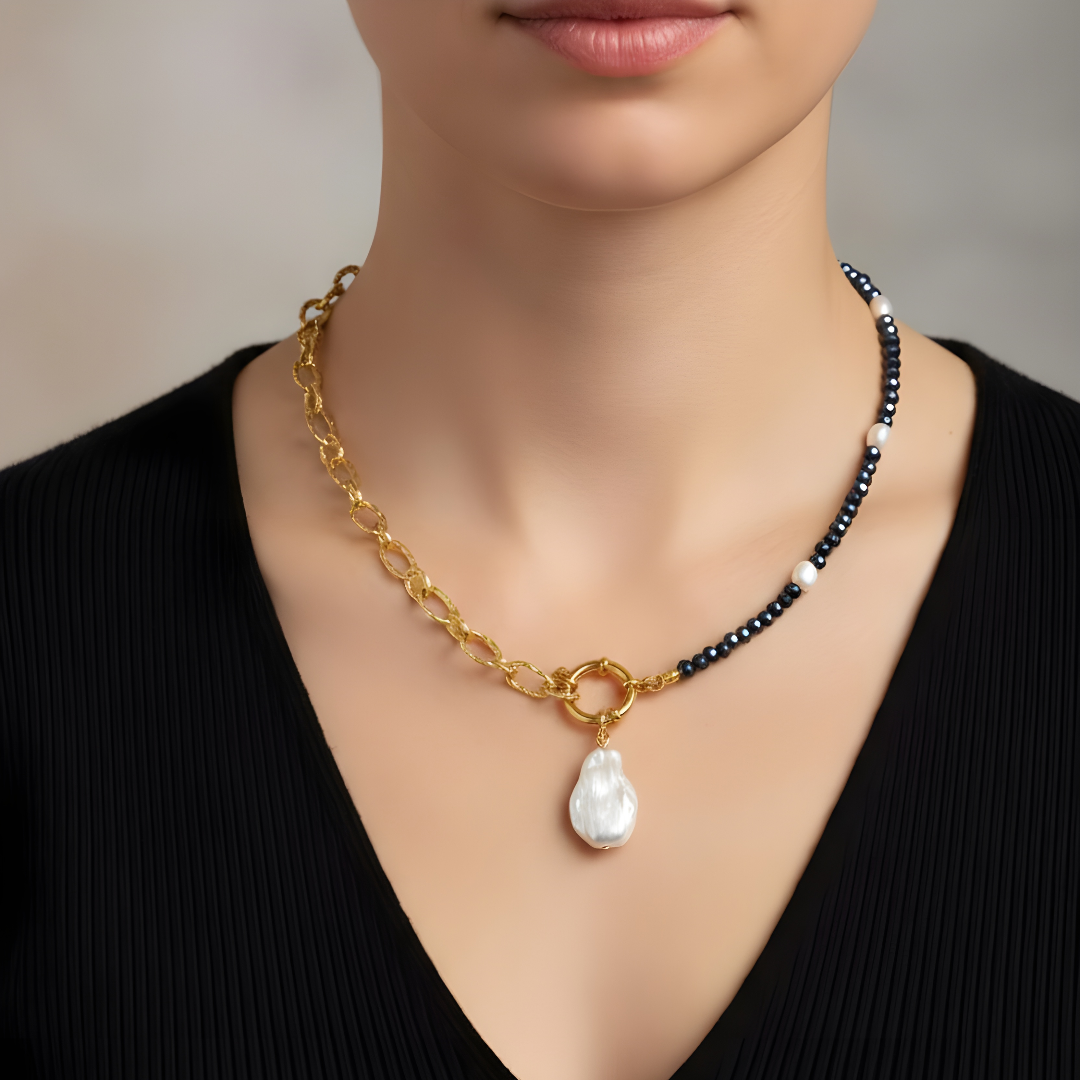 La Gargantilla Boreal es mucho más que un accesorio: es una joya que transforma cualquier look en un gesto de elegancia y autenticidad. Diseñada en acero inoxidable de alta calidad, combina la fuerza de los cristales facetados con la delicadeza de las perlas de agua dulce naturales y la personalidad única de una perla barroca natural como colgante central.