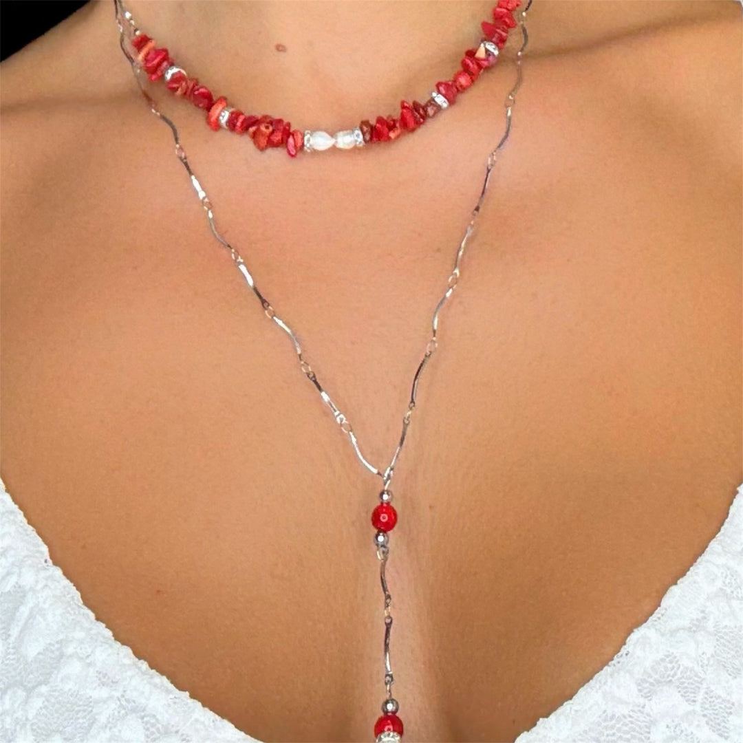 Gargantilla Corbatera de Acero con Coral Rojo y Perla – Marca Sfinge
