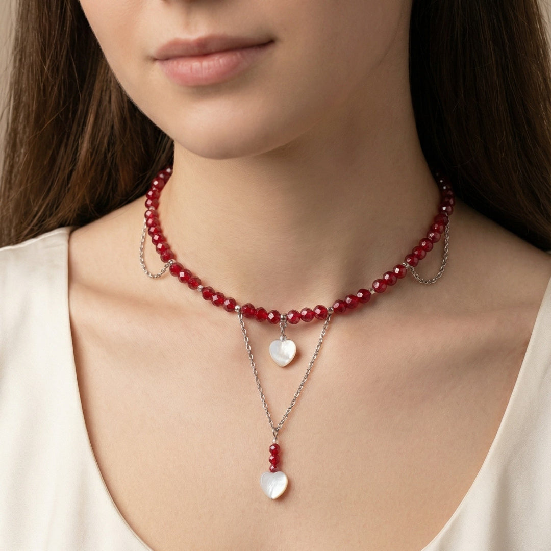 Descubre la Gargantilla Doble Corazón Rubí, una joya que combina sofisticación y delicadeza. Esta gargantilla presenta un hermoso cristal facetado en tono rubí que captura la luz de manera espectacular, acompañado de un encantador corazón de nácar que aporta un brillo sutil y elegante.