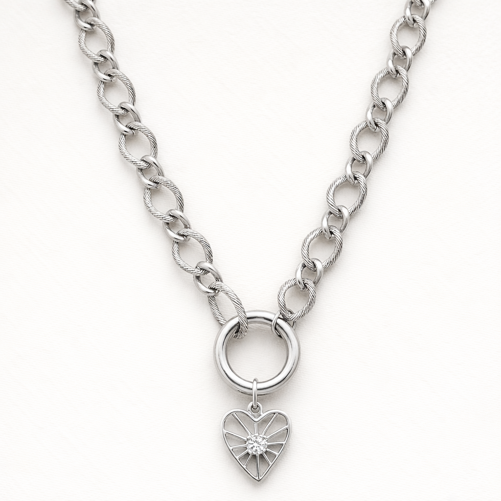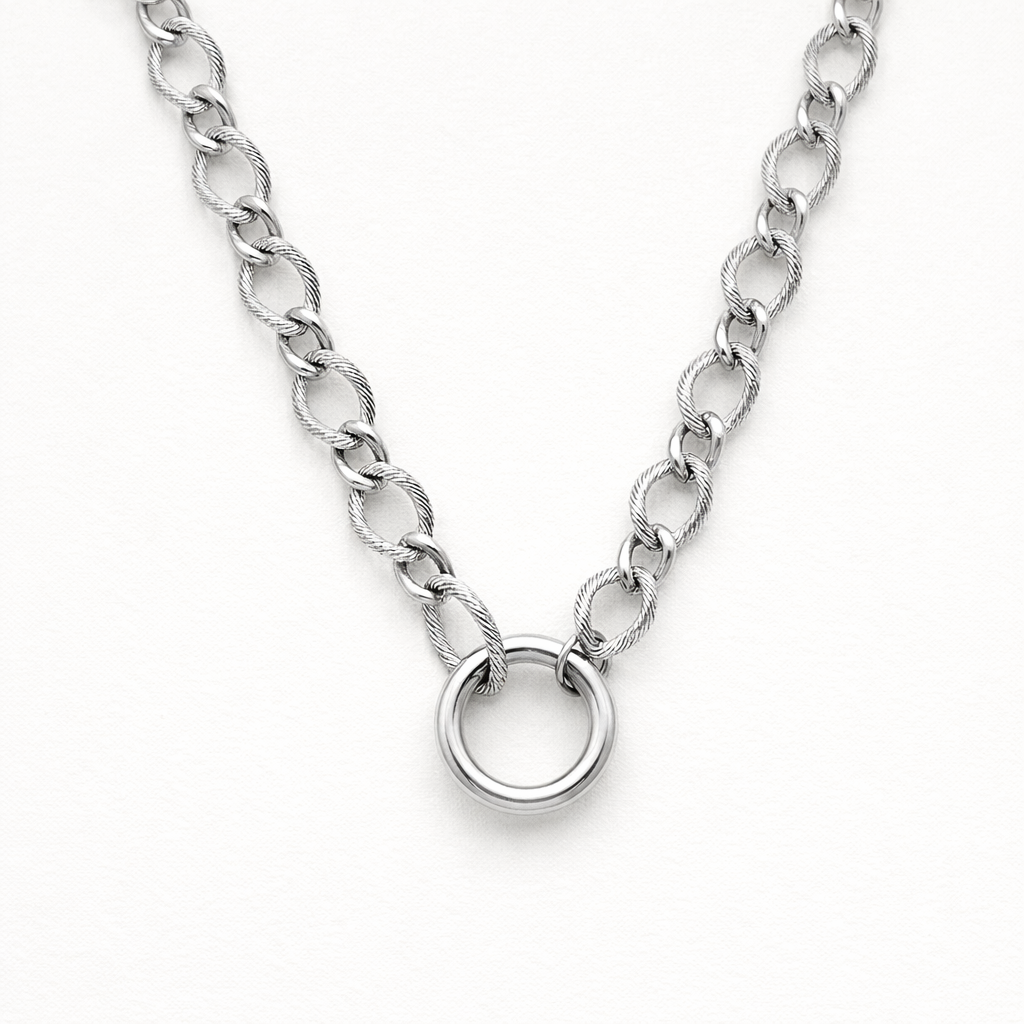 Esta gargantilla tiene un diseño precioso y muy diferente: su eslabón torsionado aporta textura y brillo, haciendo que quede elegante incluso cuando la llevas sola. Y como incluye cadena de alargador, puedes adaptarla a tu estilo: más cortita tipo choker o un poquito más larguita según el look.