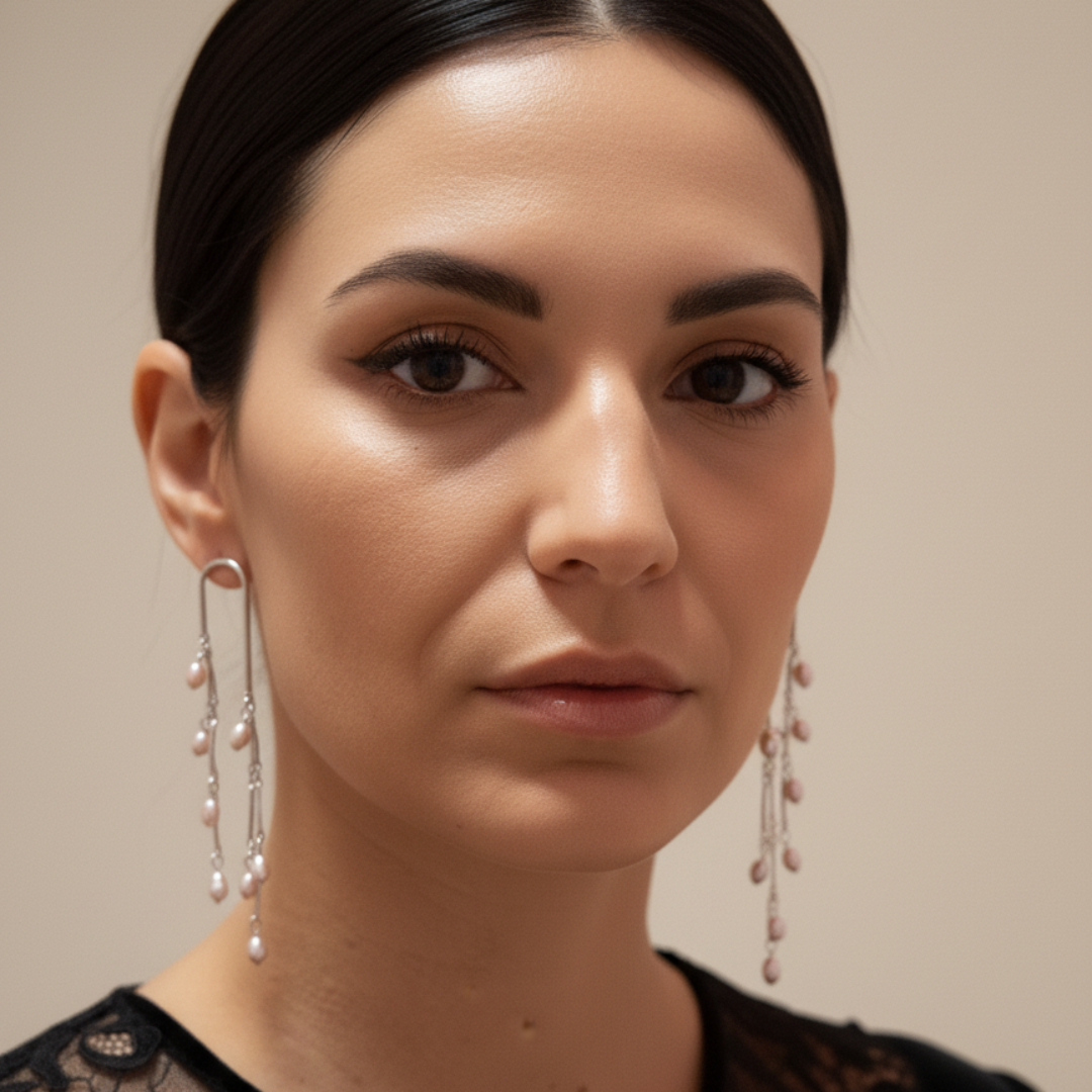 Los Pendientes Cascada de Perlas están diseñados para mujeres que buscan elegancia, movimiento y un toque de distinción. Su caída larga y estilizada simboliza fluidez, belleza y libertad, como una lluvia de luz que realza el rostro de manera sutil y sofisticada.