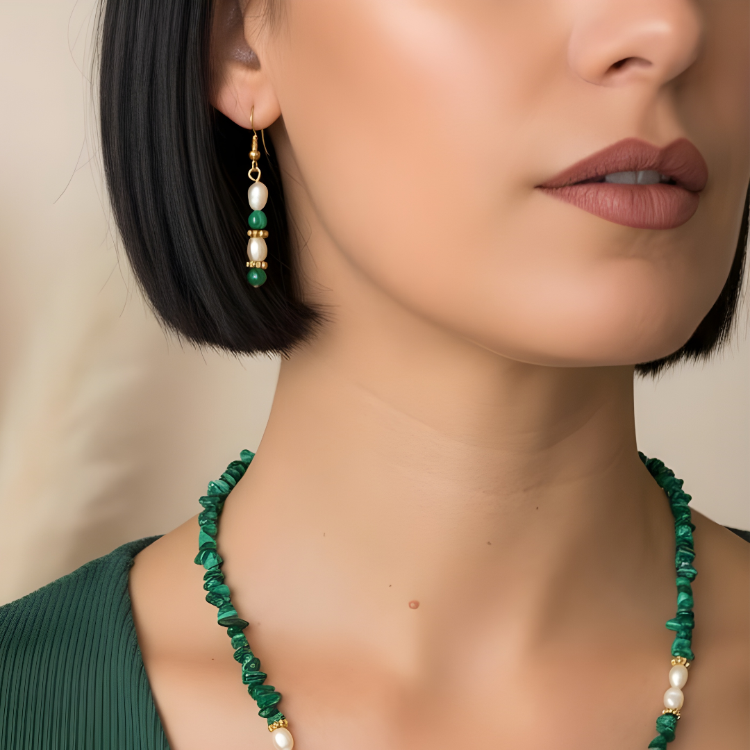 Estos pendientes combinan la energía protectora de la malaquita con la delicadeza de las perlas naturales. Un diseño artesanal exclusivo de Sfinge Joyas que resalta la belleza natural y aporta un toque sofisticado a cualquier look.