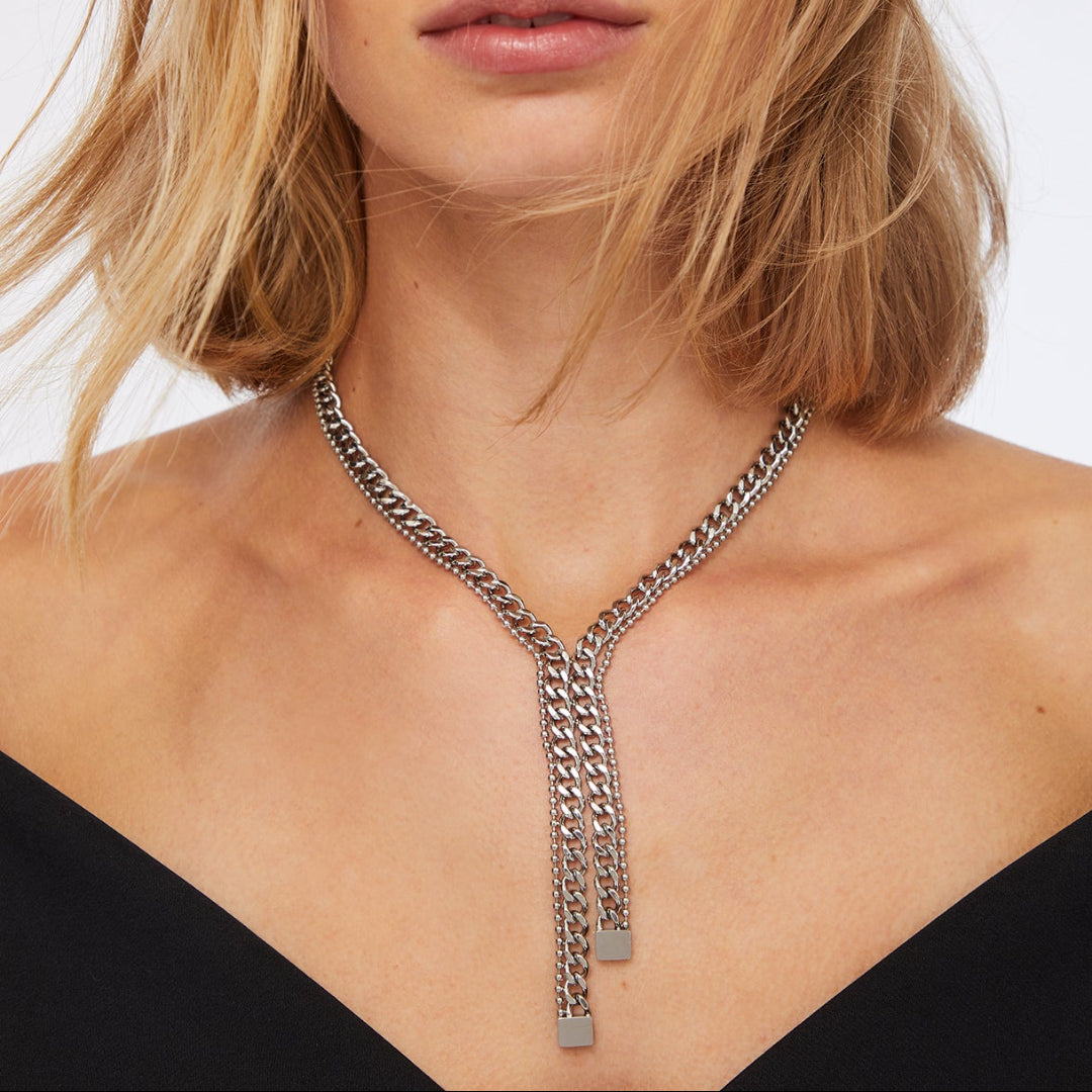 Está disponible en color dorado o plateado, permitiendo elegir el tono que mejor se adapte a tu estilo. Su diseño tipo corbatera estiliza el cuello y añade un toque de glamour a tus outfits de día o de noche.